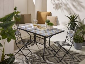 Per vivere gli spazi esterni con libertà, colore e comfort ecco la nuova Collezione Garden di arredi per esterni di Conforama Italia, pensata per offrire soluzioni funzionali, resistenti e dallo stile contemporaneo. Perfetti per chi cerca un design sobrio ma altamente funzionale, il tavolo Jazz in acciaio con piano in plastica antracite e la sedia Jazz impilabile in textilene rappresentano l’equilibrio ideale tra robustezza e leggerezza. Linee pulite e materiali durevoli li rendono ideali per ogni tipo di ambiente esterno, dal giardino urbano al balcone metropolitano. Chi ama ricevere ospiti e organizzare cene sotto le stelle apprezzerà il tavolo Strips allungabile fino a 240 cm; in alluminio, unisce estetica minimal grazie ai colori antracite e bianco e massima funzionalità. In abbinamento, la sedia con braccioli Strips, impilabile e confortevole, completa la proposta per un outdoor raffinato e dinamico. Per atmosfere più decorative e romantiche, la serie Maestrale propone tavoli in ferro verniciato nero con piano in mosaico – disponibili nella versione rotonda e rettangolare – con sedie pieghevoli coordinate.
