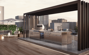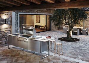 Il protagonista assoluto è l’acciaio, inox marine-grade o inox Aisi 441, materiale che garantisce una resistenza straordinaria agli agenti atmosferici, anche in ambienti salini o umidi, esalta la durabilità e assicura la massima igiene e facilità di manutenzione. Due le collezioni, Swing e Gea. La linea Swing si distingue per il design ispirato all’estetica professionale: forme essenziali, struttura in acciaio inox o antracite, modularità evoluta. Tra gli elementi troviamo piani di lavoro, lavelli e moduli refrigerati con produttore di ghiaccio, Cook Unit con bruciatori in ottone, griglie in ghisa, manopole in metallo, Barbecue Top da 70 a 90 cm, moduli BBQ con coperchio coibentato e vano bombola; frigoriferi e macchina per il ghiaccio. La linea Gea è essenziale, elegante, altamente personalizzabile con nove diverse combinazioni le cui caratteristiche chiave sono struttura in acciaio inox marine-grade; finiture nickel o nero; 4 opzioni colore per frontali (inox, nero fumo, sabbia, nuvola); moduli combinabili in altezze, larghezze e tipologie diverse; 4 configurazioni standard per 2 altezze differenti + infinite varianti custom.
